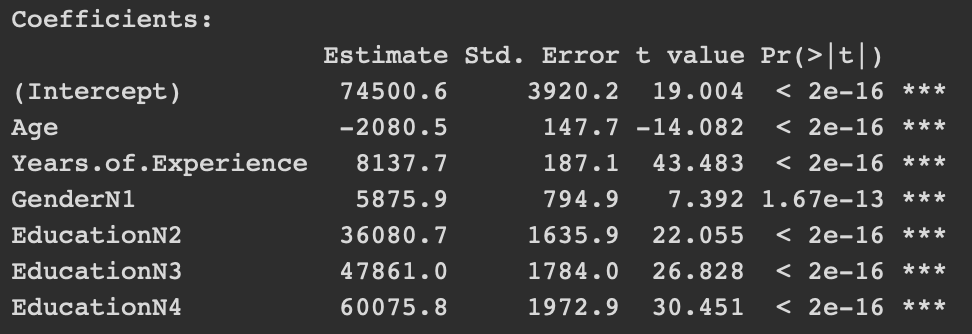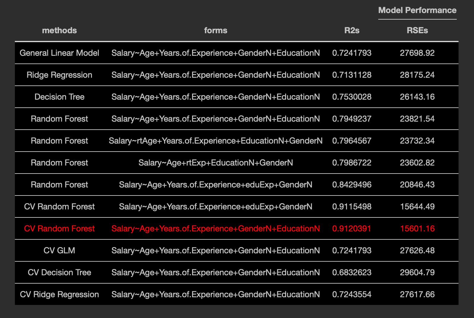 Given an R2 value of 0.91, the model is very good at predicting someones salary based on their age, years of experience, education level, and gender.