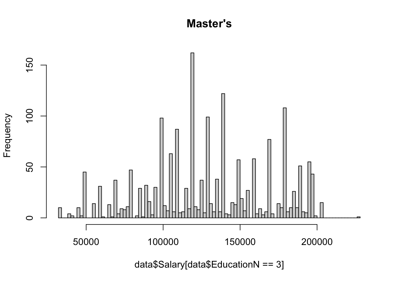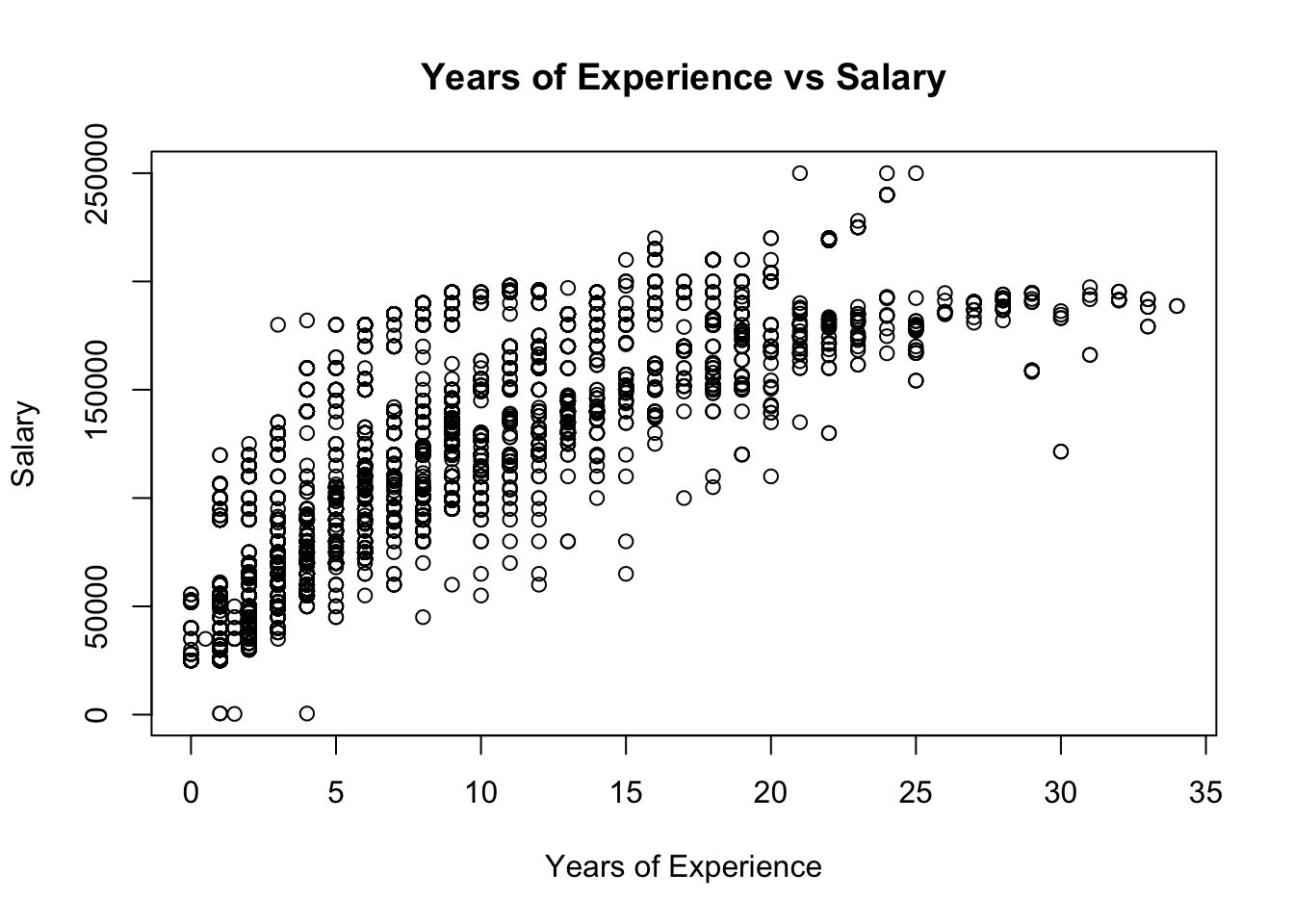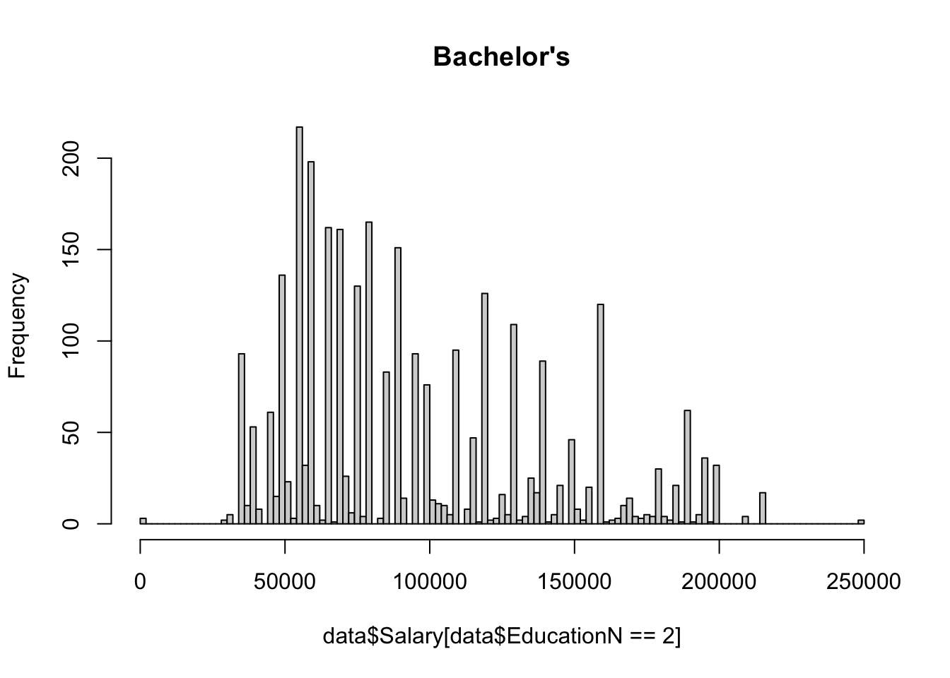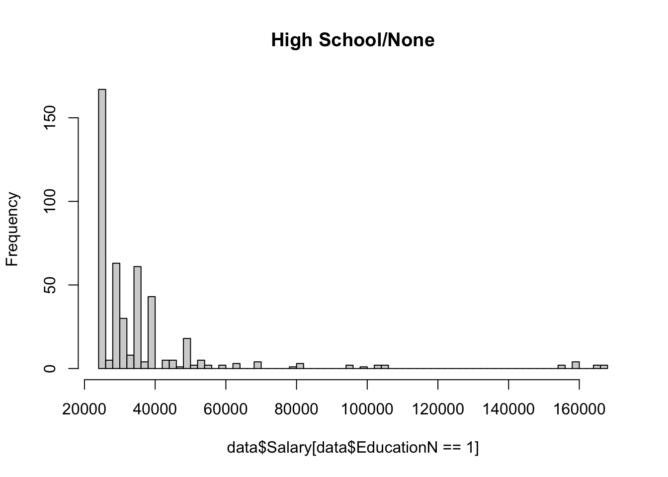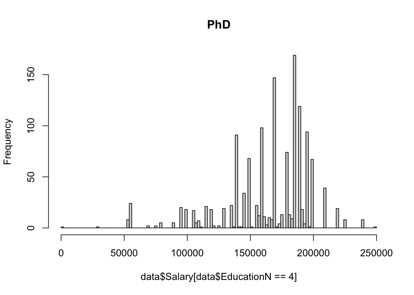 Other terms that were tried include log(age) and (years of experience)^1/4, since the relationship with salary for both of these seems to flatten out the higher the x gets. These terms effectively did not change the results in any case, so they were not selected for the final model.