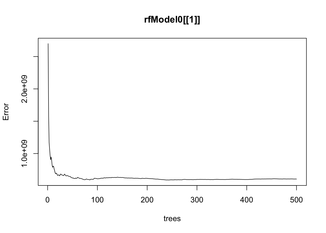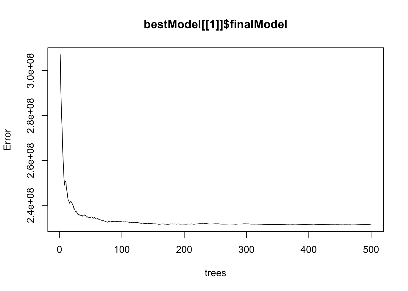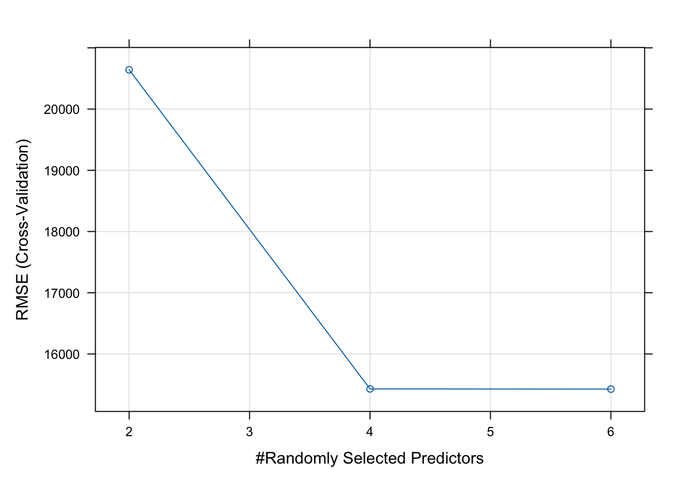 The error is lower with more randomly selected predictors. Even though there are only four predictors in the formula, this chart goes up to six, likely because the RF algorithm is using an auto-generated interaction term or something else from the dataset that was not specified.